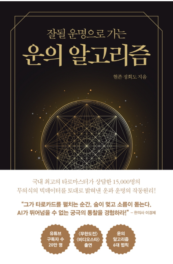 수많은 사람들을 상담하며 삶의 희로애락을 면밀하게 들여다볼 수 있었던 저자는 그동안 쌓은 빅데이터를 바탕으로 운과 운명의 원리 및 운의 알고리즘이 작동하는 법칙에 관한 통찰에 이르렀다. 뿐만 아니라 유튜브 ‘타로마스터 정회도’ 채널의 20만 구독자와 소통하며 쌓은 집단 무의식의 에너지 파동을 분석하여 《운의 알고리즘》을 집대성했다.